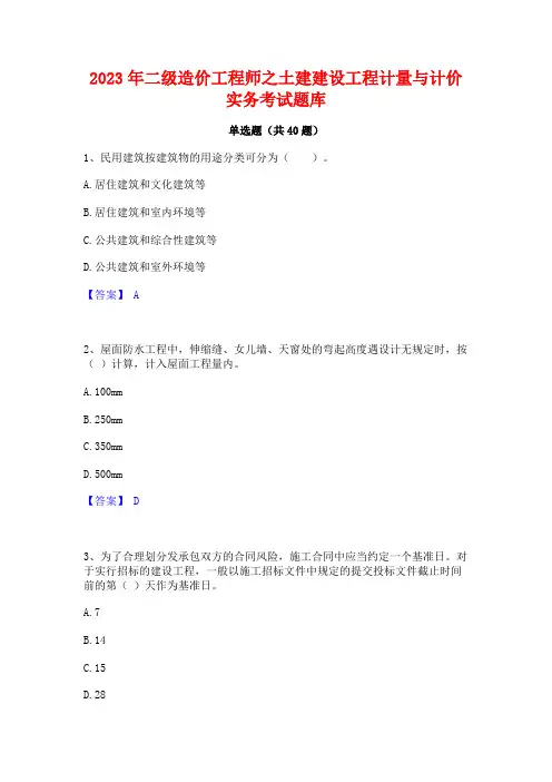 2023年二级造价工程师之土建建设工程计量与计价实务考试题库单选题(共40题)1、民用建筑按建筑物的用途分类可分为()。