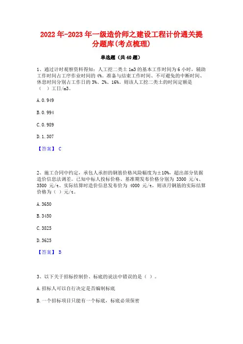 2022年-2023年一级造价师之建设工程计价通关提分题库(考点梳理)单选题(共40题)1、通过计时观察资料得知:人工挖二类土1m3的基本工作时间为6小时,辅助工作时间占工序作业时间的4%。