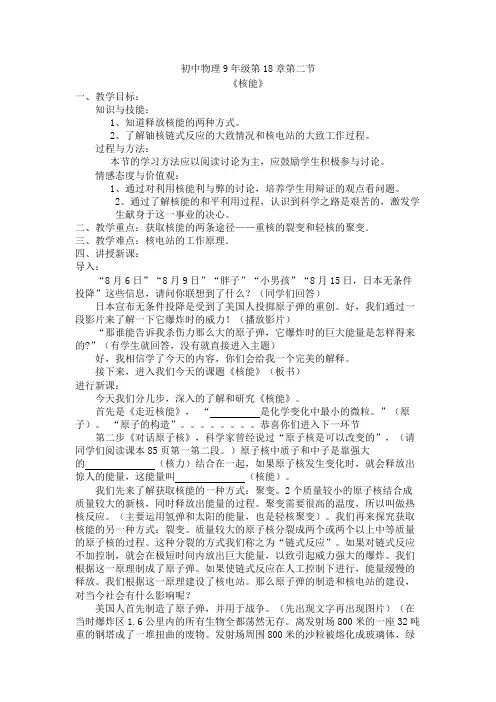 一、教学内容本节课的教学内容为苏科版物理九下第18章第2节《核能》。