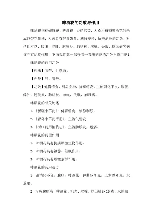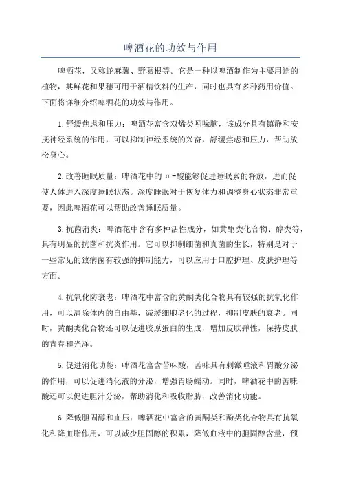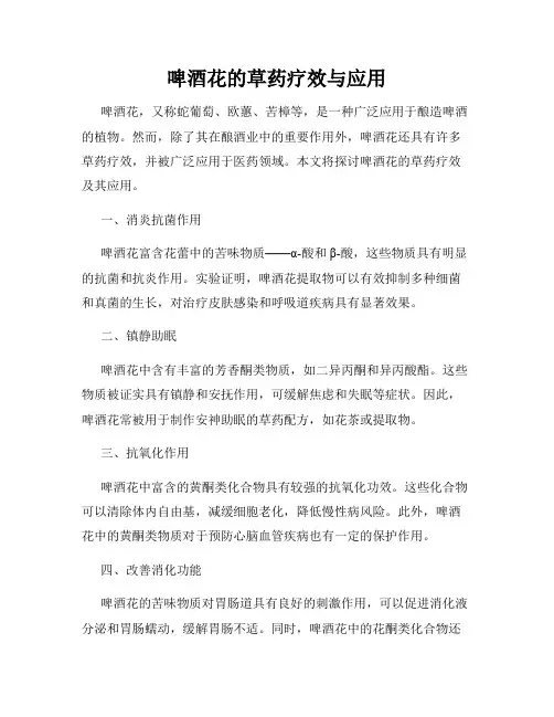 二、啤酒花的用途1. 提供苦味啤酒花的苦味是啤酒中不可或缺的成分之一。