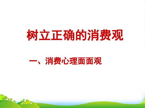 其实,我们的生活消费不仅受客观因素的影响,还受消费心理的影响,在这些因素的影响下,我们应该树立怎样的消费观?这就是第二框的内容教师首先提问: (1) 影响我们消费的心理有哪些?(2)我们应树立增氧的消费观教师:这节课我们就来学习《树立正确的消费观》。
