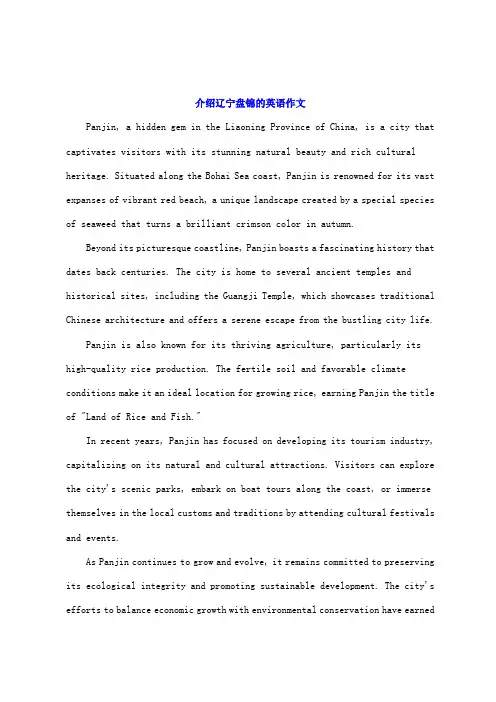 介绍辽宁盘锦的英语作文英文:As a native of Panjin, Liaoning, I am proud tointroduce this beautiful and vibrant city to you. Panjin is located in the western part of Liaoning Province, and it is known for its stunning natural scenery, rich history, and unique culture.One of the most famous attractions in Panjin is the Red Beach, which is a natural wonder of the world. Every autumn, the beach turns into a sea of red as the Suaeda salsaplants change color. It is a breathtaking sight thatattracts tourists from all over the world. In addition to the Red Beach, Panjin is also home to the Xinglong Temple, which is a thousand-year-old Buddhist temple with exquisite architecture and a peaceful atmosphere.The city is also known for its delicious cuisine, especially its seafood. Panjin is located on the coast, sofresh seafood is abundant and a must-try for visitors. From steamed crabs to braised scallops, the local seafood dishes are a true delight for food lovers.In terms of culture, Panjin has a rich history and is home to many traditional Chinese festivals and customs. For example, the Lantern Festival is celebrated with colorful lantern displays and dragon dances, creating a lively and festive atmosphere in the city.Overall, Panjin is a city that offers a perfect blend of natural beauty, cultural heritage, and delicious food.It is a place where you can experience the charm of traditional China while also enjoying modern amenities and hospitality.中文:作为辽宁盘锦的本地人,我很自豪地向你介绍这个美丽而充满活力的城市。