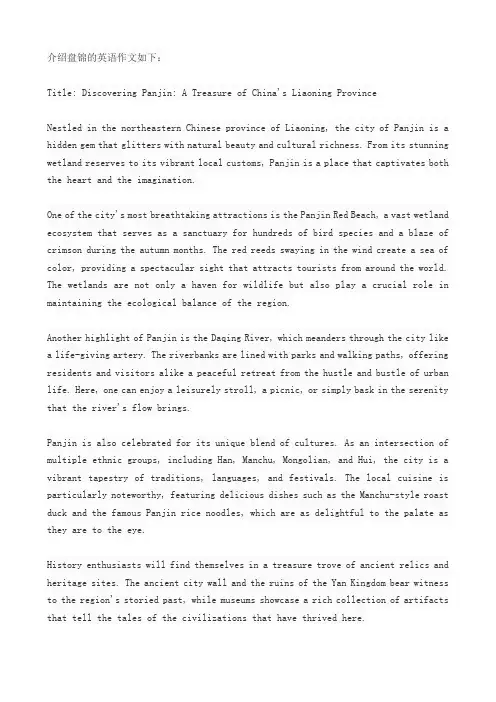 介绍盘锦的英语作文如下:Title: Discovering Panjin: A Treasure of China's Liaoning ProvinceNestled in the northeastern Chinese province of Liaoning, the city of Panjin is a hidden gem that glitters with natural beauty and cultural richness. From its stunning wetland reserves to its vibrant local customs, Panjin is a place that captivates both the heart and the imagination.One of the city's most breathtaking attractions is the Panjin Red Beach, a vast wetland ecosystem that serves as a sanctuary for hundreds of bird species and a blaze of crimson during the autumn months. The red reeds swaying in the wind create a sea of color, providing a spectacular sight that attracts tourists from around the world. The wetlands are not only a haven for wildlife but also play a crucial role in maintaining the ecological balance of the region.Another highlight of Panjin is the Daqing River, which meanders through the city like a life-giving artery. The riverbanks are lined with parks and walking paths, offering residents and visitors alike a peaceful retreat from the hustle and bustle of urban life. Here, one can enjoy a leisurely stroll, a picnic, or simply bask in the serenity that the river's flow brings.Panjin is also celebrated for its unique blend of cultures. As an intersection of multiple ethnic groups, including Han, Manchu, Mongolian, and Hui, the city is a vibrant tapestry of traditions, languages, and festivals. The local cuisine is particularly noteworthy, featuring delicious dishes such as the Manchu-style roast duck and the famous Panjin rice noodles, which are as delightful to the palate as they are to the eye.History enthusiasts will find themselves in a treasure trove of ancient relics and heritage sites. The ancient city wall and the ruins of the Yan Kingdom bear witness to the region's storied past, while museums showcase a rich collection of artifacts that tell the tales of the civilizations that have thrived here.In addition to its natural wonders and cultural landmarks, Panjin is experiencing rapid economic development, with agriculture, fisheries, and petrochemical industries forming the backbone of its economy. The city is also at the forefront of renewable energy initiatives, further solidifying its position as a forward-looking destination.In conclusion, Panjin is much more than just another city in Liaoning Province; it is an enchanting tableau of natural splendor, cultural diversity, and economic dynamism. A visit to Panjin is a journey into a world where tradition and modernity coexist harmoniously, and where every step taken is a discovery of something new and fascinating. It is indeed a place that leaves you yearning for more—a testament to its enduring appeal.。