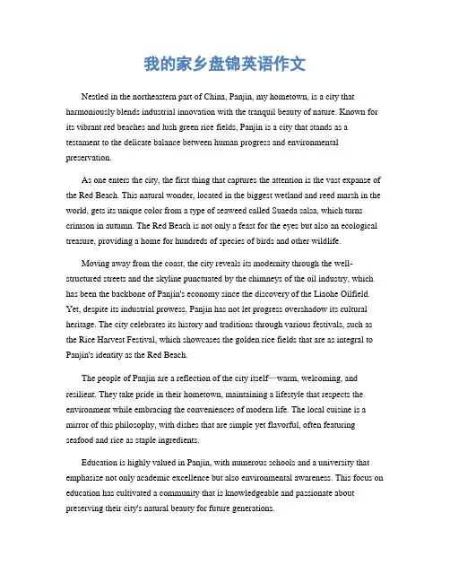 家乡英语作文盘锦Panjin, My Hometown - A Unique Blend of Nature and ModernityNestled in the northeastern corner of China, the city of Panjin stands as a testament to the harmonious coexistence of nature and progress. As a native of this captivating place, I am proud to share the wonders that make Panjin a truly remarkable hometown.Panjin's most striking feature is its stunning natural landscape. The city is home to the Liaohe River Delta, a vast wetland ecosystem that has been designated as a UNESCO World Heritage Site. This lush, verdant expanse is a haven for a diverse array of flora and fauna. The iconic red beach, formed by the growth of a unique type of seaweed, is a breathtaking sight that draws visitors from around the world. During the summer months, the beach is blanketed in a vibrant crimson hue, creating a mesmerizing contrast with the azure waters of the Bohai Sea.Beyond the natural wonders, Panjin also boasts a rich cultural heritage. The city's history can be traced back to the Han Dynasty,and its ancient roots are evident in the well-preserved historical sites scattered throughout the region. The Panjin Museum, for instance, is a treasure trove of artifacts and exhibits that offer a glimpse into the city's storied past. Visitors can explore ancient tombs, admire intricate jade carvings, and learn about the traditional customs and practices that have shaped the local way of life.Alongside its historical significance, Panjin has also embraced the challenges of modern development. The city has undergone a remarkable transformation in recent decades, emerging as a hub of economic and technological innovation. The Panjin Economic and Technological Development Zone, for example, has attracted a diverse range of industries, from high-tech manufacturing to renewable energy research. This strategic investment in the future has not only bolstered Panjin's economic growth but has also positioned the city as a leader in sustainable development.One of the most striking aspects of Panjin is its commitment to environmental protection. The city has implemented a comprehensive plan to preserve its natural resources and promote eco-friendly practices. The Liaohe River Delta, in particular, is the subject of extensive conservation efforts, with measures in place to safeguard the delicate ecosystem and its unique wildlife. Panjin's dedication to environmental stewardship has earned it recognition as a "National Ecological Civilization Demonstration City," a prestigiousaccolade that showcases the city's unwavering commitment to sustainable development.Beyond its natural and economic achievements, Panjin is also renowned for its vibrant cultural life. The city hosts a variety of festivals and events throughout the year, each celebrating the rich tapestry of local traditions and customs. The Panjin International Wetland Festival, for instance, is a highly anticipated event that draws visitors from around the world to experience the region's natural beauty and engage in a wide range of cultural activities. From traditional dance performances to culinary demonstrations, the festival offers a immersive glimpse into the unique character of Panjin.The city's commitment to preserving its cultural heritage is also evident in its well-preserved historic districts. The Old Town of Panjin, for example, is a charming neighborhood that transports visitors back in time. Winding alleyways lined with traditional courtyard houses, bustling local markets, and quaint teahouses all contribute to the area's timeless ambiance. It is here that one can truly feel the heartbeat of Panjin's vibrant community, where the past and present coexist in perfect harmony.As a native of Panjin, I am immensely proud of the city's remarkable achievements and its unwavering dedication to sustainabledevelopment. The city's ability to seamlessly blend its natural wonders, cultural heritage, and modern progress is a testament to the resilience and vision of its people. Whether you are drawn to the stunning landscapes, the rich history, or the dynamic economic opportunities, Panjin is a city that has something to offer everyone.In conclusion, Panjin is a truly unique and captivating hometown that exemplifies the best of what China has to offer. Its natural beauty, cultural diversity, and forward-thinking approach to development make it a destination that is well worth exploring. As I continue to call Panjin my home, I am confident that this remarkable city will continue to inspire and captivate visitors from all corners of the world.。