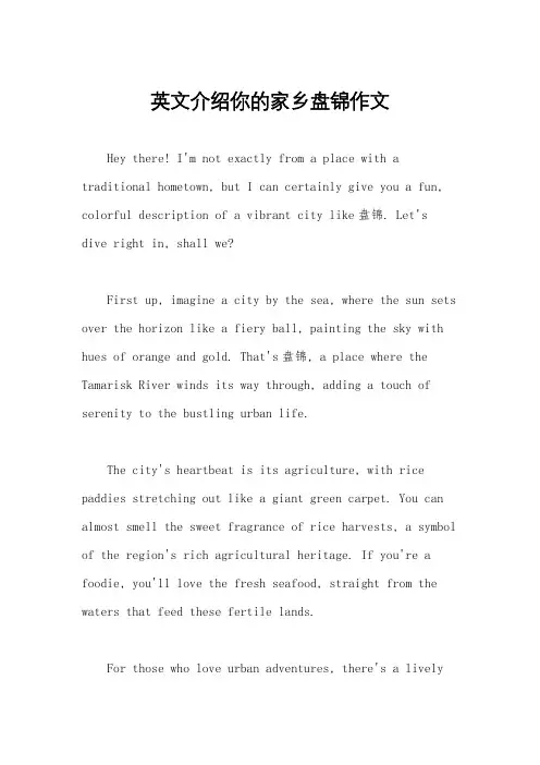 英文介绍你的家乡盘锦作文Hey there! I'm not exactly from a place with a traditional hometown, but I can certainly give you a fun, colorful description of a vibrant city like盘锦. Let'sdive right in, shall we?First up, imagine a city by the sea, where the sun sets over the horizon like a fiery ball, painting the sky with hues of orange and gold. That's盘锦, a place where the Tamarisk River winds its way through, adding a touch of serenity to the bustling urban life.The city's heartbeat is its agriculture, with rice paddies stretching out like a giant green carpet. You can almost smell the sweet fragrance of rice harvests, a symbol of the region's rich agricultural heritage. If you're a foodie, you'll love the fresh seafood, straight from the waters that feed these fertile lands.For those who love urban adventures, there's a livelyarts scene. The city hosts annual festivals, where local artists showcase their talents, painting a canvas ofculture on the streets. The Art Walk, a must-visit, takes you through galleries and studios, where you can find unique pieces that reflect the region's artistic soul.Oh, and don't forget the people! They're friendly, hardworking, and always up for a chat. They've got a knack for making you feel at home, even if you're miles away from your own. They're the glue that binds this city together, creating a warm and welcoming atmosphere.In essence,盘锦 isn't just a place; it's a blend of nature, culture, and community. So, if you're ever lucky enough to visit, get ready for a journey that's as diverse as the city itself. Enjoy the ride, my friend!。