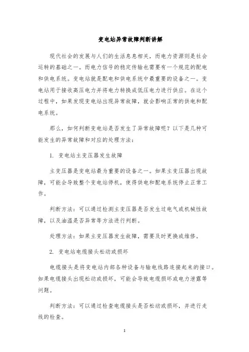 变电站异常故障判断讲解变电站作为电力系统的重要组成部分,一旦发生故障将会影响到整个电网的正常运行。