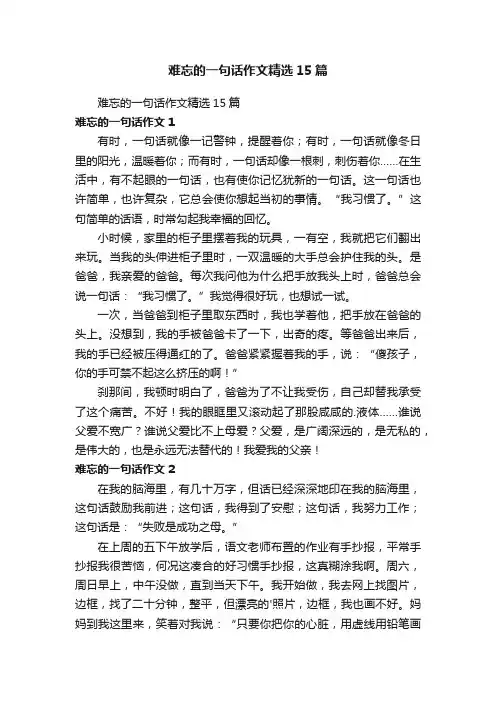 难忘的一句话作文精选15篇难忘的一句话作文精选15篇难忘的一句话作文1有时,一句话就像一记警钟,提醒着你;有时,一句话就像冬日里的阳光,温暖着你;而有时,一句话却像一根刺,刺伤着你……在生活中,有不起眼的一句话,也有使你记忆犹新的一句话。