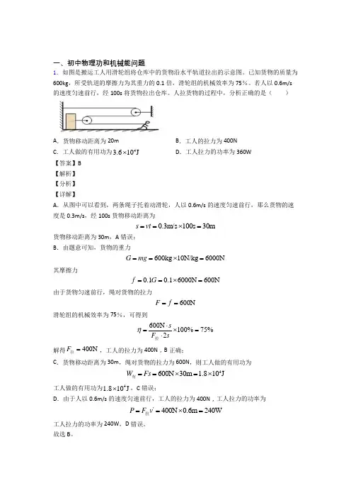 人拉货物的过程中,分析正确的是( )A .货物移动距离为20mB .工人的拉力为400NC .工人做的有用功为43.610J ⨯D .工人拉力的功率为360W【答案】B【解析】【分析】【详解】A .从图中可以看到,两条绳子托着动滑轮,人以0.6m/s 的速度匀速前行,那么货物的速度是0.3m/s ,经100s 货物移动距离为 0.3m/s 100s 30m s vt ==⨯=货物移动距离为30m ,A 错误;B .由题意可知,货物的重力600kg 10N/kg 6000N G mg ==⨯=其摩擦力0.10.16000N 600N f G ==⨯=由于货物匀速前行,绳对货物的拉力600N F f ==滑轮组的机械效率为75%,可得到600N 100%75%2s F sη⋅=⨯=⋅拉 解得400N F =拉,工人的拉力为400N ,B 正确;C .货物移动距离为30m ,绳对货物的拉力为600N ,则工人做的有用功为4600N 30m 1.810J W Fs ==⨯=⨯有工人做的有用功为41.810J ⨯,C 错误;D .由于人以0.6m/s 的速度匀速前行,工人的拉力为400N ,工人拉力的功率为'400N 0.6m 240W P F v ==⨯=拉工人拉力的功率为240W ,D 错误。