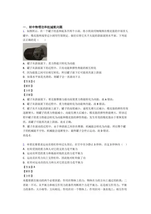 一、初中物理功和机械能问题1.如图所示,一个玩具弹簧放在斜面上端,将弹簧弯曲一定程度后释放,弹簧沿斜面向下翻滚.弹簧在运动过程中,有哪些机械能发生了转化A.只有动能和重力势能B.只有动能和弹性势能C.只有重力势能和弹性势能D.动能、重力势能和弹性势能都发生了转化【答案】D【解析】【详解】根据题意,玩具弹簧放在斜面上端,将弹簧弯曲一定程度后释放,弹簧沿斜面向下翻滚.首先将弹簧作为一个简单对象考虑,向下翻滚过程中,质量不变,但高度降低了,所以重力势能会减小;弹簧弹起后,另一端接触斜面时,动能减小,弹性势能增大,且减小的重力势能,会转化弹簧的弹性势能,即弹簧的弹性形变变大;弹簧弹起时,弹性势能又转化为动能.所以这个过程中,动能、重力势能和弹性势能都发生了转化,故D正确.2.关于能的概念,以下说法正确的是()A.在空中飞行的子弹,因为它能够做功,所以子弹具有能B.悬吊着的小球,从竖直方向拉开一个角度后,因为小球不能做功,所以小球不具有能C.甲物体比乙物体的速度大,则甲物体的动能一定比乙物体的动能大D.甲物体的位置比乙物体的位置高,则甲物体的势能一定比乙物体的势能大【答案】A【解析】【分析】【详解】A.在空中飞行的子弹,因为它能够做功,所以具有能,A正确;B.悬吊着的小球,从竖直方向拉开一个角度后,尽管小球不能做功,但是它具有一定高度,具有重力势能,B错误;C.甲物体比乙物体的速度大,但是如果甲物体的质量比乙物体的质量小很多,那么甲物体的动能将会比乙物体的动能小,C错误;D.甲物体的位置比乙物体的位置高,但是如果甲物体的质量比乙物体的质量小,那么甲物体的势能可能比乙物体的势能小,D错误。