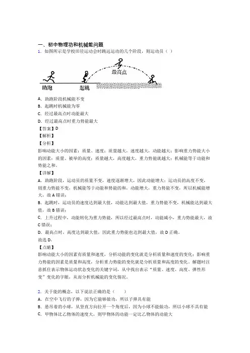 一、初中物理功和机械能问题1.如图所示是学校田径运动会时跳远运动的几个阶段,则运动员()A.助跑阶段机械能不变B.起跳时机械能为零C.经过最高点时动能最大D.经过最高点时重力势能最大【答案】D【解析】【分析】影响动能大小的因素:质量、速度;质量越大,速度越大,动能越大;影响重力势能大小的因素:质量、被举的高度;质量越大,高度越大,重力势能就越大;机械能等于动能和势能之和。