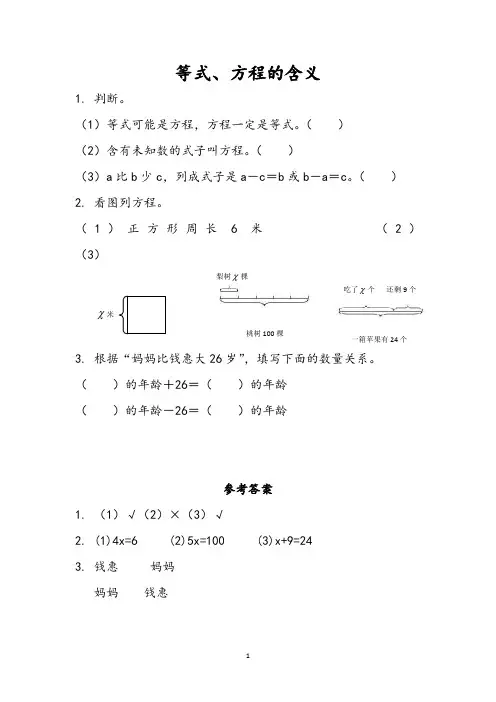 ( )的年龄+26=( )的年龄( )的年龄-26=( )的年龄参考答案1. (1)√(2)×(3)√2. (1)4x=6 (2)5x=100 (3)x+9=243. 钱惠 妈妈妈妈 钱惠梨树χ棵 桃树100棵 吃了χ个 还剩9个 一箱苹果有24个χ米用等式性质解方程(1)1. 在○里填上“>”、“<”或“=”。