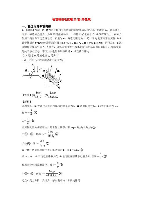 【物理】物理稳恒电流题20套(带答案)含解析一、稳恒电流专项训练1.如图10所示,P 、Q 为水平面内平行放置的光滑金属长直导轨,相距为L 1 ,处在竖直向下、磁感应强度大小为B 1的匀强磁场中.一导体杆ef 垂直于P 、Q 放在导轨上,在外力作用下向左做匀速直线运动.质量为m 、每边电阻均为r 、边长为L 2的正方形金属框abcd 置于倾斜角θ=30°的光滑绝缘斜面上(ad ∥MN ,bc ∥FG ,ab ∥MG, dc ∥FN),两顶点a 、d 通过细软导线与导轨P 、Q 相连,磁感应强度大小为B 2的匀强磁场垂直斜面向下,金属框恰好处于静止状态.不计其余电阻和细导线对a 、d 点的作用力. (1)通过ad 边的电流I ad 是多大? (2)导体杆ef 的运动速度v 是多大?【答案】(1)238mg B L (2)1238mgrB B dL【解析】试题分析:(1)设通过正方形金属框的总电流为I ,ab 边的电流为I ab ,dc 边的电流为I dc , 有I ab =34I ① I dc =14I ② 金属框受重力和安培力,处于静止状态,有mg =B 2I ab L 2+B 2I dc L 2 ③由①~③,解得I ab =2234mgB L ④ (2)由(1)可得I =22mgB L ⑤设导体杆切割磁感线产生的电动势为E ,有E =B 1L 1v ⑥设ad 、dc 、cb 三边电阻串联后与ab 边电阻并联的总电阻为R ,则R =34r ⑦ 根据闭合电路欧姆定律,有I =E R⑧ 由⑤~⑧,解得v =121234mgrB B L L ⑨ 考点:受力分析,安培力,感应电动势,欧姆定律等.2.为了测量一个阻值较大的末知电阻,某同学使用了干电池(1.5V ),毫安表(1mA ),电阻箱(0~9999W ),电键,导线等器材.该同学设计的实验电路如图甲所示,实验时,将电阻箱阻值置于最大,断开2K ,闭合1K ,减小电阻箱的阻值,使电流表的示数为1I =1.00mA ,记录电流强度值;然后保持电阻箱阻值不变,断开1K ,闭合2K ,此时电流表示数为1I =0.80mA ,记录电流强度值.由此可得被测电阻的阻值为____W .经分析,该同学认为上述方案中电源电动势的值可能与标称值不一致,因此会造成误差.为避免电源对实验结果的影响,又设计了如图乙所示的实验电路,实验过程如下: 断开1K ,闭合2K ,此时电流表指针处于某一位置,记录相应的电流值,其大小为I ;断开2K ,闭合1K ,调节电阻箱的阻值,使电流表的示数为___ ,记录此时电阻箱的阻值,其大小为0R .由此可测出x R = .【答案】0375,,I R 【解析】解:方案一中根据闭合电路欧姆定律,有E=I 1(r+R 1+R 2) (其中r 为电源内阻,R 1为电阻箱电阻,R 2为电流表内阻) E=I 2(r+R 1+R 2+R ) 由以上两式可解得 R=375Ω方案二是利用电阻箱等效替代电阻R 0,故电流表读数不变,为I ,电阻箱的阻值为R 0. 故答案为375,I ,R 0.【点评】本题关键是根据闭合电路欧姆定律列方程,然后联立求解;第二方案是用等效替代法,要保证电流相等.3.要描绘某电学元件(最大电流不超过6m A,最大电压不超过7V)的伏安特性曲线,设计电路如图,图中定值电阻R为1KΩ,用于限流;电流表量程为10m A,内阻约为5Ω;电压表(未画出)量程为10V,内阻约为10KΩ;电源电动势E为12V,内阻不计。