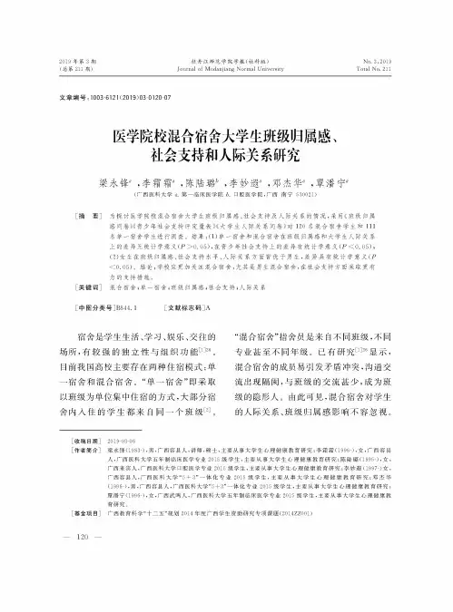 医学院校混合宿舍大学生班级归属感、社会支持和人际关系研究作者:陈陆璐李妙遐邓杰华覃潘宁来源:《牡丹江师范学院学报(哲学社会科学版)》2019年第03期[摘 要] 为探讨医学院校混合宿舍大学生班级归屬感、社会支持及人际关系的情况,采用《班级归属感问卷》《青少年社会支持评定量表》《大学生人际关系问卷》对120名混合宿舍学生和111名单一宿舍学生进行测查。