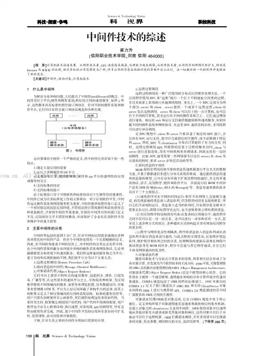 中间件技术的综述作者:崔力升来源:《科技视界》 2014年第3期崔力升(信阳职业技术学院,河南信阳 464000)【摘要】计算机技术迅速发展。