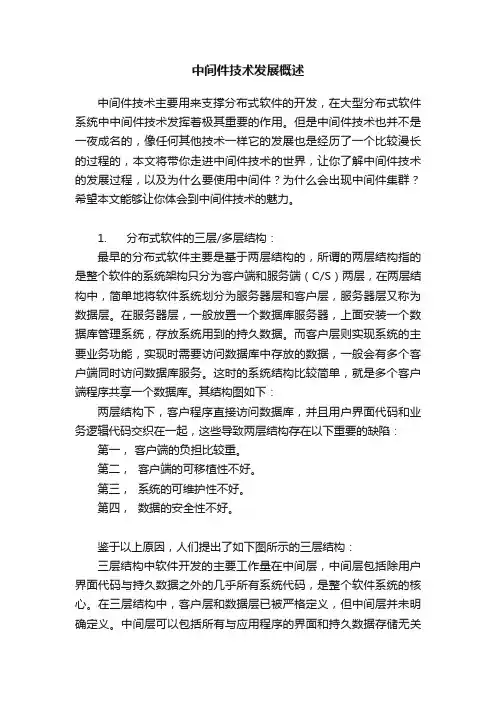 指出了中间件的优缺点,并分析了中间件技术的现状,最后介绍了中间件的应用前景和发展趋势。