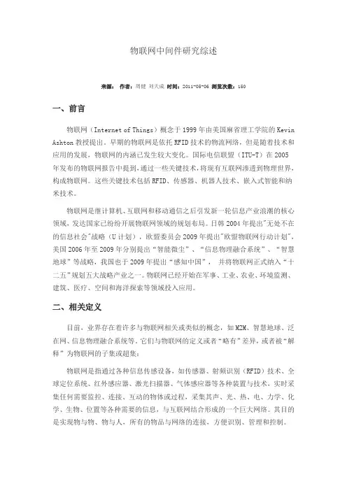 物联网中间件研究综述来源:作者:周健刘天成时间:2011-05-06 浏览次数:150一、前言物联网(Internet of Things)概念于1999年由美国麻省理工学院的Kevin Ashton教授提出。
