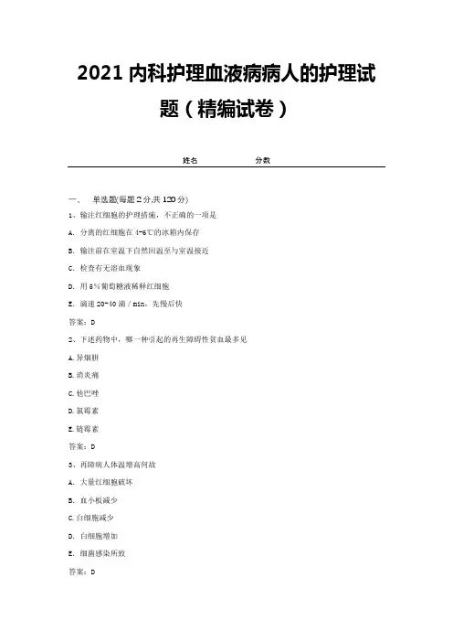 2021内科护理血液病病人的护理试题(精编试卷)姓名分数一、单选题(每题2分,共120分)1、输注红细胞的护理措施,不正确的一项是A.分离的红细胞在4-6℃的冰箱内保存B.输注前在室温下自然回温至与室温接近C.检查有无溶血现象D.用5%葡萄糖液稀释红细胞E.滴速20-40滴/min,先慢后快答案:D2、下述药物中,哪一种引起的再生障碍性贫血最多见A.异烟肼B.消炎痛C.他巴唑D.氯霉素E.链霉素答案:D3、再障病人体温增高何故A.大量红细胞破坏B.血小板减少C.白细胞减少D.白细胞增加E.细菌感染所致答案:D4、急性白血病与急性再障最简单的区别是A.红细胞减少B.血小板减少C.血中有原始及早幼粒细胞D.网织红细胞减少E.发热答案:C5、下列哪一组症状符合再生障碍性贫血A.贫血、出血、肝肿大、未梢血幼稚细胞为0.08B.贫血、出血、发热、全血细胞减少C.出血、轻度贫血、脾大、血小板20×109/LD.贫血、出血、黄疸、血红蛋白尿E.贫血、乏力、巨脾答案: B6、张先生,40岁,患“慢性粒细胞白血病(慢粒)”3年,近日来出现原因不明的高热,胸骨疼痛难忍,脾迅速增大。