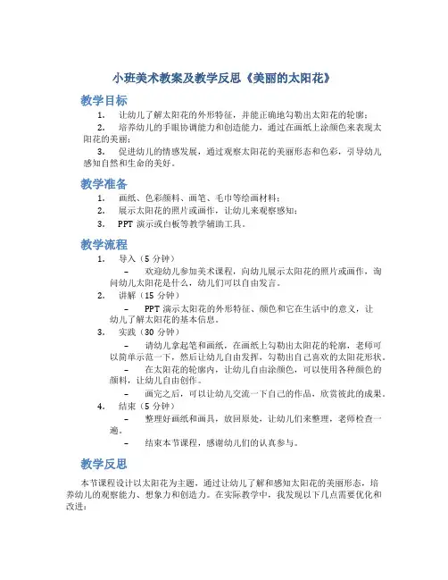小班美术教案及教学反思《美丽的太阳花》小班美术教案及教学反思《美丽的太阳花》精选3篇(一)教案:美丽的太阳花教学目标:1. 了解太阳花的外形和颜色特征。