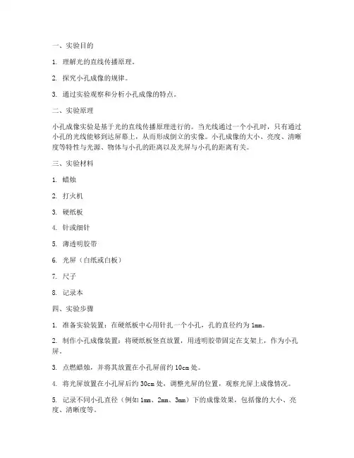 一、实验目的1. 理解光的直线传播原理;2. 探究小孔成像的规律;3. 观察小孔成像的特点,包括成像的倒立性和大小变化等。