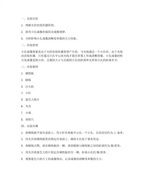 三、实验器材1. 蜡烛2. 硬纸片3. 小针4. 火柴5. 蓝色大纸片6. 夹具7. 直尺8. 记录本四、实验步骤1. 制作小孔:将硬纸片固定在桌面上,用小针在纸片中心扎一个小孔,孔的直径约为1mm。