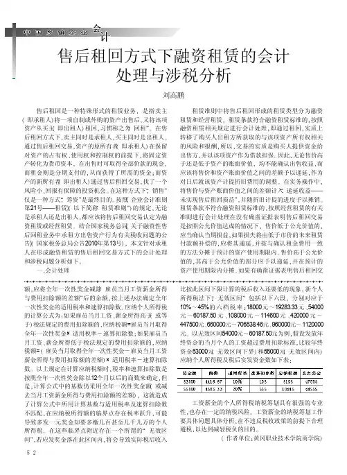 一、售后回租业务的会计核算和税务处理方法(一)售后回租业务的会计核算对于售后回租业务,会计上的处理是根据实质重于形式的原则,没有将出售和出租业务单独割裂开来,而是作为一个业务活动。