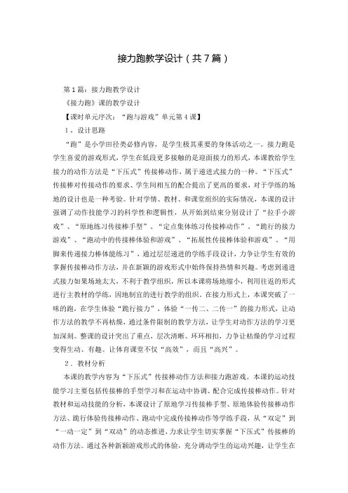 接力跑教学设计(共7篇)第1篇:接力跑教学设计《接力跑》课的教学设计【课时单元序次:“跑与游戏”单元第4课】1,设计思路“跑”是小学田径类必修内容,是学生极其重要的身体活动之一。