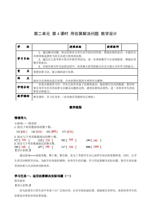 第1篇:《估算》教学设计《估算》教学设计【教学内容】人教版小学数学教材二年级下册第98页【教学目标】1.体会估算在日常生活中的应用价值,增加估算的意识,并能结合详细情境选择适当的单位进行简洁的估算。