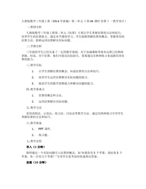 人教版数学三年级上册第二单元《第04课时估算》(说课稿)一. 教材分析《人教版数学三年级上册》第二单元《估算》的内容主要包括整数和分数的估算方法。