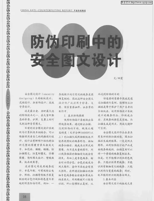 1.钞票版面的防伪设计在钞票版面的设计中,不影响主景图像的情况下,多使用精致细密的图案和几何花纹群,利用有规律的密集花纹或无规律的机理图案达到较好的防伪效果;同时,还可采用特殊网点、缩微文字、隐蔽处做暗记等设计手段达到防伪的目的。