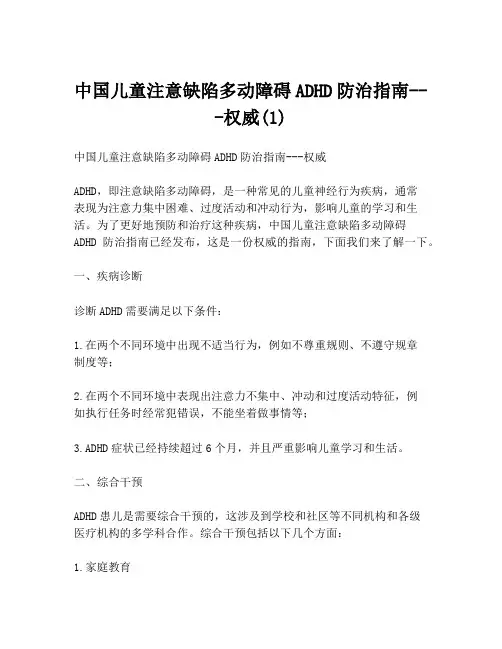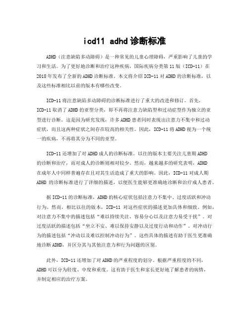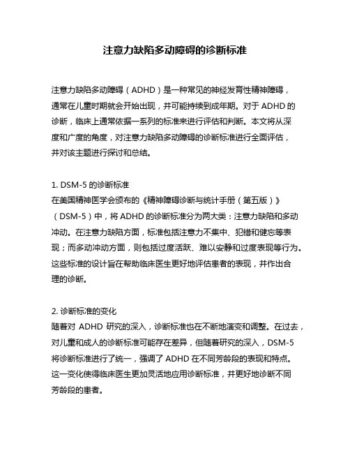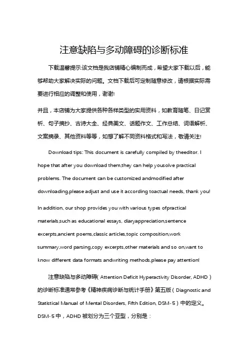 文档下载后可定制随意修改,请根据实际需要进行相应的调整和使用,谢谢!并且,本店铺为大家提供各种各样类型的实用资料,如教育随笔、日记赏析、句子摘抄、古诗大全、经典美文、话题作文、工作总结、词语解析、文案摘录、其他资料等等,如想了解不同资料格式和写法,敬请关注!Download tips: This document is carefully compiled by theeditor. I hope that after you download them,they can help yousolve practical problems. The document can be customized andmodified after downloading,please adjust and use it according toactual needs, thank you! In addition, our shop provides you with various types ofpractical materials,such as educational essays, diaryappreciation,sentence excerpts,ancient poems,classic articles,topic composition,work summary,word parsing,copy excerpts,other materials and so on,want to know different data formats andwriting methods,please pay attention!注意缺陷与多动障碍(Attention Deficit Hyperactivity Disorder, ADHD)的诊断标准通常参考《精神疾病诊断与统计手册》第五版(Diagnostic and Statistical Manual of Mental Disorders, Fifth Edition, DSM-5)中的定义。