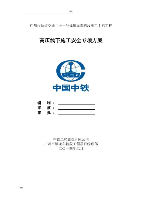 一、编制依据1. 《中华人民共和国安全生产法》2. 《中华人民共和国消防法》3. 《施工现场临时用电安全技术规范》(JGJ46-2005)4. 《高压线下施工作业安全技术规范》5. 相关行业标准和规范二、适用范围本方案适用于高压线下进行各类施工作业,包括但不限于土建施工、管道安装、设备调试等。