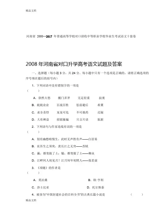 河南省 2008--2017 年普通高等学校对口招收中等职业学校毕业生考试语文十套卷2008年河南省对口升学高考语文试题及答案一、选择题(每小题3分,共24分。