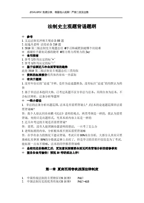 ²参考1.文运法制史冲刺主观必备88题2.赵逸凡老师 法综必备216题3.2019第二版法制史主观题总结 @学习和减肥到底哪个比较难²感谢给予最初灵感的捷哥 @努力努力再努力的Jay²食用指南1.参考2/3均认定的标"*"2.参考3/3均认定的标"!"²鉴于法硕近几年全面背诵的趋势此处2019第二版法制史主观题总结三类均取²资料的拓展部分的具体内容也一并添加²有关于题型1.没有年份后的"论述"字样,是作为论述题准备,没有标注"论述"的均默认为简答2.基于非法法本趋同大势,已考过真题不区分非法与法本。