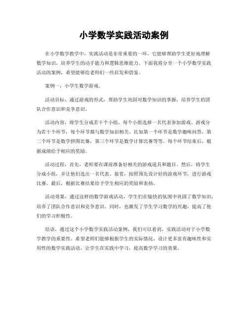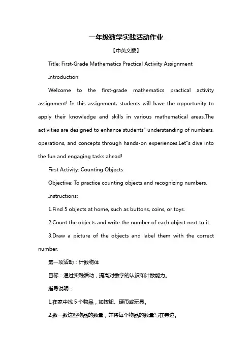 一年级数学实践活动作业【中英文版】Title: First-Grade Mathematics Practical Activity AssignmentIntroduction:Welcome to the first-grade mathematics practical activity assignment! In this assignment, students will have the opportunity to apply their knowledge and skills in various mathematical areas.The activities are designed to enhance students" understanding of numbers, operations, and concepts through hands-on experiences.Let"s dive into the fun and engaging tasks ahead!First Activity: Counting ObjectsObjective: To practice counting objects and recognizing numbers.Instructions:1.Find 5 objects at home, such as buttons, coins, or toys.2.Count the objects and write the number of each object next to it.3.Draw a picture of the objects and label them with the correct number.第一项活动:计数物体目标:通过实践活动,提高对数字的认识和计数能力。
