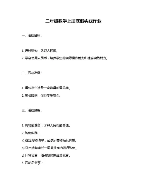 2024年三年级寒假数学实践作业设计一、作业目标本次寒假数学实践作业旨在巩固学生在课堂上学到的数学知识,培养他们的数学思维和实际应用能力。