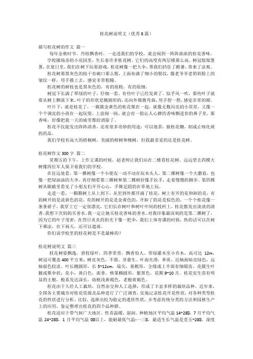 桂花树说明文(优秀8篇)描写桂花树的作文篇一每年金秋时节,丹桂飘香时,一走进我们的学校,就会闻到一阵阵浓浓的桂花香味。