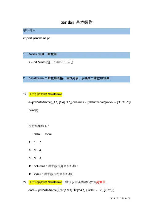 一、Pandas的基本概念1. 数据结构:Pandas提供了两种主要的数据结构:Series和DataFrame。