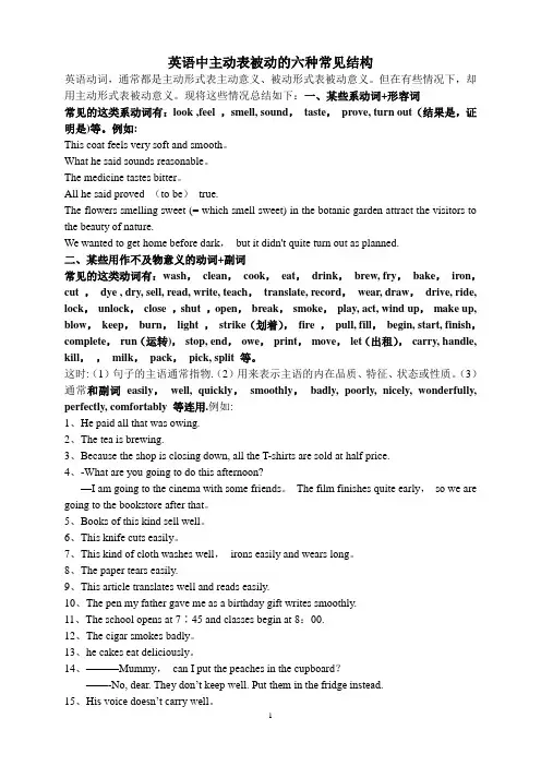 英语主动表被动用法归纳一、谓语动词用主动表被动的五种情形(1)某些连系动词(如look, sound, smell, feel, taste, prove等)要用主动表被动,因为连系动词为不及物动词,它们没有被动语态形式:That dog looks dangerous. 那只狗看起来很危险。