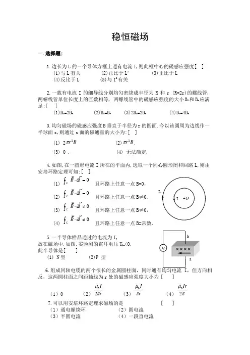 稳恒磁场一.选择题:1.边长为L 的一个导体方框上通有电流I,则此框中心的磁感应强度[ ]. (1)与L 有关 (2)正比于L 2 (3)正比于L(4)反比于L (5)与I 2有关2.一载有电流I 的细导线分别均匀密绕成半径为R 和r (R=2r)的螺线管,两螺线管单位长度上的匝数相等,•两螺线管中的磁感应强度的大小B R 和B r 应满足:[ ](1)B R =2B r (2)B R =B r (3)2B R =2B r (4)B R =4B r3.均匀磁场的磁感应强度B 垂直于半径为r 的圆面.今以该圆周为边线作一半球面s,则通过s 面的磁通量的大小为:[ ](1) 2B r 2π (2)B r 2π.(3) 0 . (4) 无法确定.4.如图,在一圆形电流I 所在的平面内,选取一个同心圆形闭和回路L,则由安培环路定理可知:[ ](1) 0=⋅⎰Ll B d 且环路上任意一点B=0,(2) 0=⋅⎰Ll Bd 且环路上任意一点B ≠0, (3) 0≠⋅⎰Ll Bd 且环路上任意一点B ≠0,(4) 0≠⋅⎰Ll B d 且环路上任意一点B=常数。