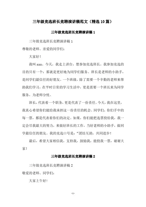 三年级竞选班长竞聘演讲稿范文(精选10篇)三年级竞选班长竞聘演讲稿1三年级竞选班长竞聘演讲稿1尊敬的老师、亲爱的同学们:大家好!我叫xxx。