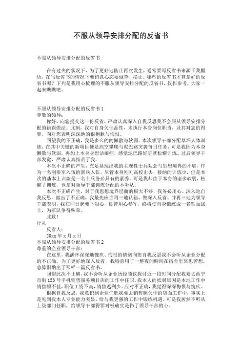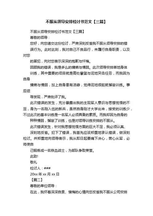 谢谢!此致敬礼[您的名字]不服从公司安排的检讨书(二)[你可以根据这个范文修改,使其符合你的具体情况]尊敬的XX领导:您好!我是 XX ,在此写下这篇检讨书,对于我不服从安排一事,我深感抱歉并对我的行为向您表示诚挚的道歉。