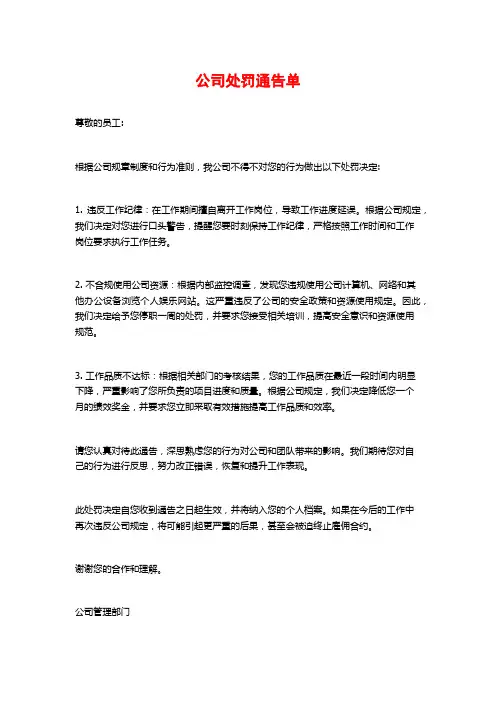 员工处罚通告单尊敬的全体员工:本公司一直以来秉持着公平、公正、严谨的原则,严格遵守劳动法律法规,保障员工的权益,维护公司的正常运转。