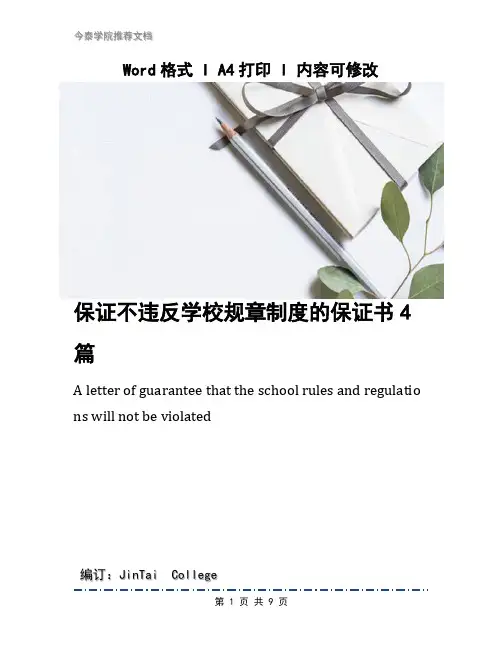Word格式 I A4打印 I 内容可修改保证不违反学校规章制度的保证书4篇A letter of guarantee that the school rules and regulatio ns will not be violated编订:JinTai College保证不违反学校规章制度的保证书4篇前言:保证书是个人、集体、单位,为响应上级号召开展工作、完成任务或做错了事,犯了错误并决心改正面提出保证时使用的专用书信信或文字材料。