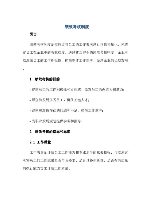 绩效考核制度是绩效管理的具体操作方式,包括以下几个方面:1. 考核指标:设定明确的考核指标,与员工的工作目标和绩效目标相匹配。