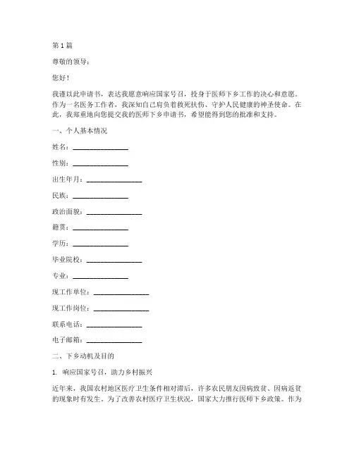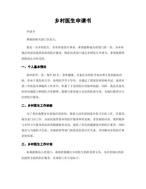 三、申请理由1. 专业背景:我具备扎实的医学专业知识,能够为乡村居民提供专业的医疗服务。