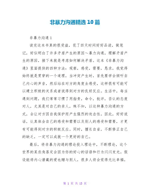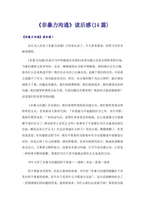 《非暴力沟通》读后感(14篇)《非暴力沟通》读后感1自认为上次读《非暴力沟通》已经很认真了,今天拿来重读,居然又有好多新的感悟。