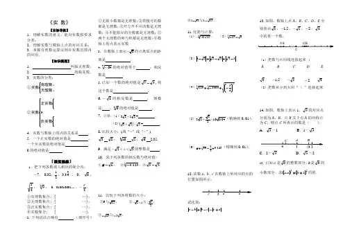 《实 数》【目标导航】1.理解实数的意义,能对实数按要求分类;2.理解实数与数轴上点的对应关系;3.掌握有理数运算法则在实数范围内的应用.【知识梳理】1. 叫做无理数. 2. 统称实数. 3.实数的分类:①⎩⎨⎧无理数:有理数:实数②⎪⎪⎪⎩⎪⎪⎪⎨⎧⎩⎨⎧⎩⎨⎧负实数正实数实数04.实数与数轴上的点的关系是 .5.一个正实数的绝对值是 , 一个负实数的绝对值是 . 0的绝对值是 .【课堂操练】1.把下列各数填入相应的集合内:-7, 0.32,31,•413. , 0, 8,21, 39, 0.010010001K ,-2π. ①有理数集合: { …};②无理数集合: { …}; ③正实数集合: { …};④实数集合: { …}. 2.下列说法正确有 .(填序号)①无限小数都是无理数;②带根号的数都是无理数;③开方开不尽的数是无理数;④不能除尽的分数都是无理数;⑤两个无理数的和与积都是无理数;⑥数轴上的点表示实数3. 在数轴上表示3-的点离原点的距离是 .4.364-的绝对值等于 ;相反数是 .5.已知一个数的绝对值是37-,则这个数是 . 6.-2的相反数是 , 倒数是 ,36的绝对值是 .7. 计算:(1)3233+= . (2)()223-+= .8.比较大小:(填“>”或“<”)32; 3105;6 2.35.9.满足32<<-x 的整数是 . 10.求下列各数的相反数与绝对值:①6-π; ②31250.-;③35-11.比较下列各组数的大小:①6与35; ②51-+与2-;③43-与53-;④111-与131-.11.化简与计算:(1)30.125--; (2)9273--(3)233221-+-+-(4)233431000125⎪⎭⎫ ⎝⎛-+-+(5)522100.04+-(精确到0. 01);(6)14503110.+-+π(精确到0. 01);12.实数a 、b 、c 在数轴上所对应的点的位置如图所示,试化简:a c cb b a +--+-13.如图,数轴上点A 、B 、C 、D 、E 分别表示3,5.1-,5-,2-,2 中的某一个数,(1)把数与点用线连接起来 :A B C D E3 5.1- 5- 2- 2(2)把数从小到大用“ < ”连接起来14.如图,数轴上表示1、3的对应点分别为A 、B ,点B 关于点A 的对称点为C ,则点C 所表示的数是( ). A .3-1 B .1-3C .2-3D .3-215.已知a 是8的整数部分,b 是8的小数部分,求()()232++-b a 的值.BD C EA O【课后巩固】1.有下列说法:①无理数就是开方开不尽的数; ②带根号的数都是无理数;③在实数范围内,一个数如果不是有理数,则一定是无理数;④无理数都可以用数轴上的点来表示. 其中正确的说法的个数是( )2.下列各组数中,互为相反数的是( )A .-2与22)(-B .-2与38-C .-2与 21-D .2-与23.在实数范围内,下列判断正确的是( )A .若y x =, 则x =yB .若x >y , 则22y x > C .若()2y x = , 则x =yD .若33y x =, 则x =y4.算式b a +--3有最大值,这时a 与b 的关系是( ) A .a 与b 相等 B .a 与b 互为相反数C .a 与b 同号, D .不存在 5.在-52,3π3.14,0,1,21-中,其中:整数有 ; 无理数有 ; 有理数有 . 6.已知a 是小于53+的整数,且22-=-a a ,那么a 的所有可能值是 . 7.下列实数:π273211623712,.,,,-中,有理数有 . 8.数轴上表示3.2的点与π点的距离是 .9.若5=x ,则x = ; 若12=-x ,则x = . 10.比较大小:-7;-23;32-21- 11.若某个数的平方根是2a +3和3a +27,则这个数是 . 12.若05=-++x y x , 则32y x = .13.使得x 24是整数的最小正整数x 是14.大于11-而小于5的所有整数的和是 .15.计算下列各式的值(1)+ (2+(3))(16643---(4) ()()22323223-+- (5) 332+-π (精确到0.01)12.已知2-x 有意义, 化简12---x x13.已知()023132=-++y x ,求-18 xy 的平方根.14.某居民生活小区需要建一个大型的球形储水罐, 需储水13.5立方米,那么这个球罐的半径r 为多少米(球的体积V=ππ,343r 取3.14, 结果精确到0.1米)?【拓展应用】 1.已知55+与55-的小数部分分别是a ,b ,求22b a -的值.。