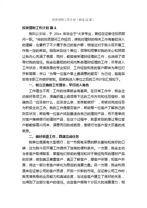 投资理财工作计划(精选12篇)投资理财工作计划篇1我叫公文站,于20xx年毕业于*大学专业,曾经在证券任投资顾问一职。