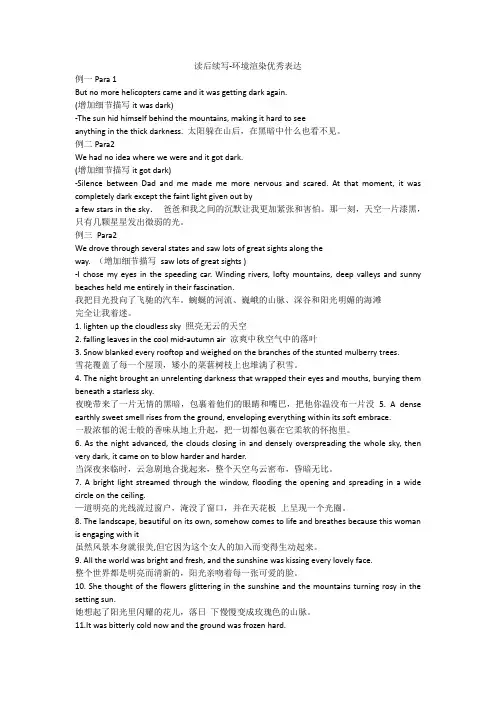读后续写-环境渲染优秀表达例一Para 1But no more helicopters came and it was getting dark again.(增加细节描写it was dark)-The sun hid himself behind the mountains, making it hard to seeanything in the thick darkness. 太阳躲在山后,在黑暗中什么也看不见。