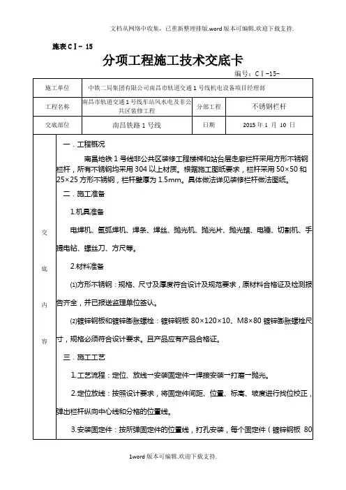 不锈钢楼梯栏杆技术交底技术交底书工程名称施工单位交底内容:一、作业条件楼梯间墙面涂料完成、楼梯间窗户安装完成、楼梯间地砖全部完成。